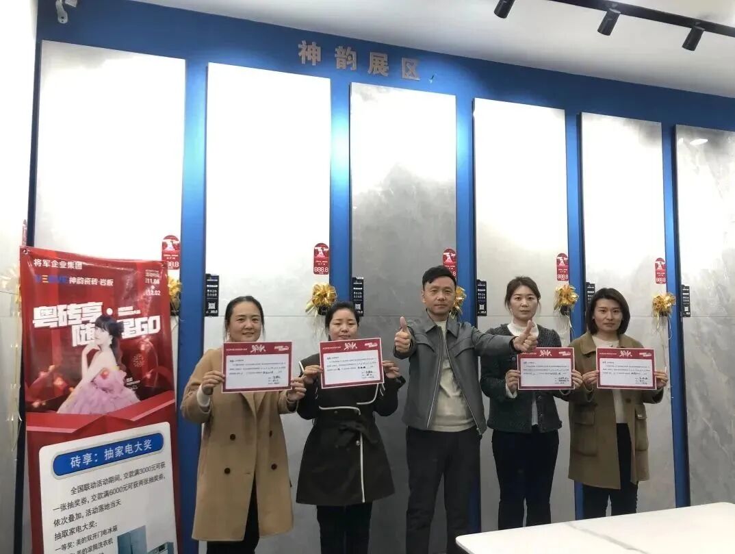 神韻瓷磚·巖板品牌總經理王琪,永年郝飛建材總經理郝飛,將軍陶瓷集團市場部賦能經理劉海波及區域終端經銷商、終端客戶等出席了本次收官活動。活動通過線上抽獎營銷、線下現場互動的雙向沖擊,使得整個收官活動倍增氛圍感,影響力十足,為全國終端門店及客戶獻上了一場空前的鉅惠盛宴。